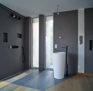 Le lavabo sur pied blanc et structuré, conçu par le Designer Antonio Lupi, contribue à dispenser cette atmosphère contemporaine à la pièce, ajoutant une touche de sophistication et d'élégance.