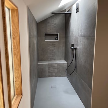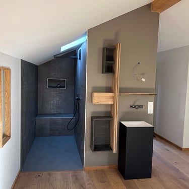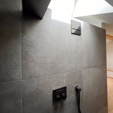 La salle de bain a été conçue avec élégance et fonctionnalité. Elle se compose d’une douche ouverte, équipée de matériel haut de gamme du créateur Gessi offrant une douche pluie et une cascade, commandé par un mitigeur thermostatique pour une expérience de douche luxueuse et relaxante. Un lavabo sur pied noir du designer Antonio Lupi ajoute une touche de sophistication, tandis que des toilettes fermées garantissent l'intimité et le confort, avec une élégance remarquable.