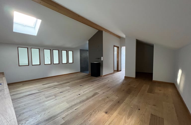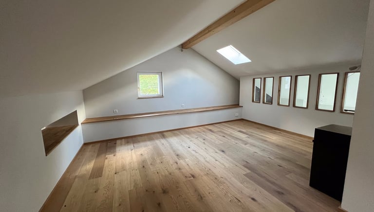 La conception des combles a été pensée pour maximiser la luminosité et créer une ambiance contemporaine. De petites fenêtres stratégiquement placées apportent une touche unique à la pièce à vivre, tout en inondant l'espace de lumière naturelle, créant ainsi une atmosphère accueillante et chaleureuse.